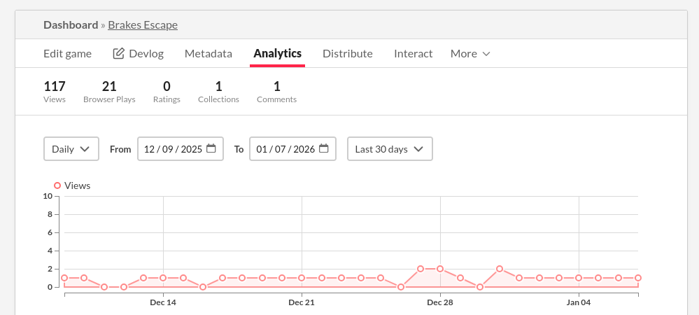 According to itch.io analytics, on most days, at least one person visits Brakes Escape. I suspect it’s just one person, who has made it one of their favorite time wasters. I think that’s cool! None of my other games exhibit that sort of steady usage pattern. It’s a small impact, but… it’s impact.